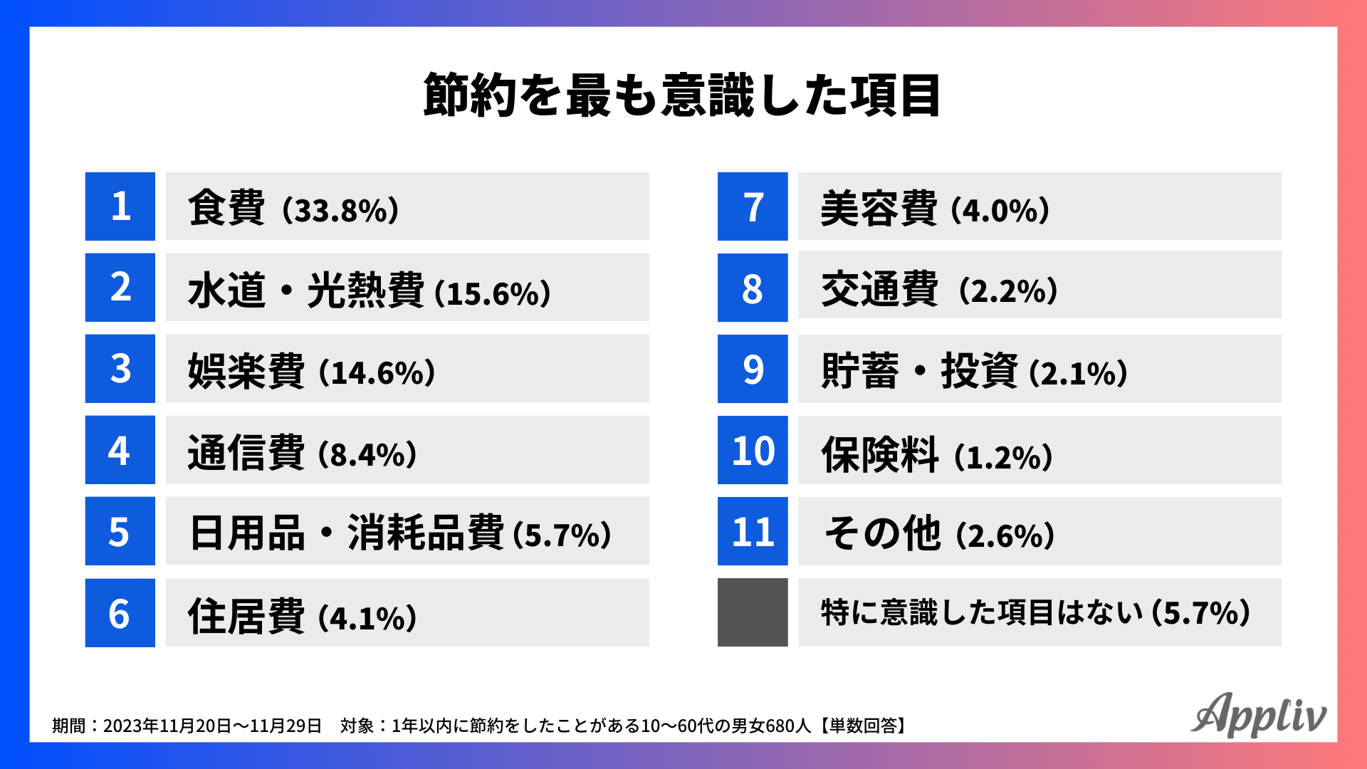 節約に取り組む上で意識していた費用を尋ねると、「食費(33.8%)」が最も多く、次いで「水道・光熱費(15.6%)」、「娯楽費(14.6%)」でした。