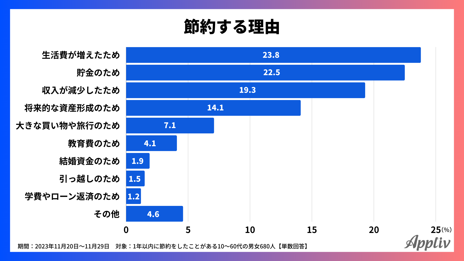 過去1年間に節約に取り組んだ経験がある680人に、節約する理由を聞いてみると、最も多かったのは「生活費が増えたため(23.8%)」、次いで「貯金のため(22.5%)」、「収入が減少したため(19.3%)」でした。