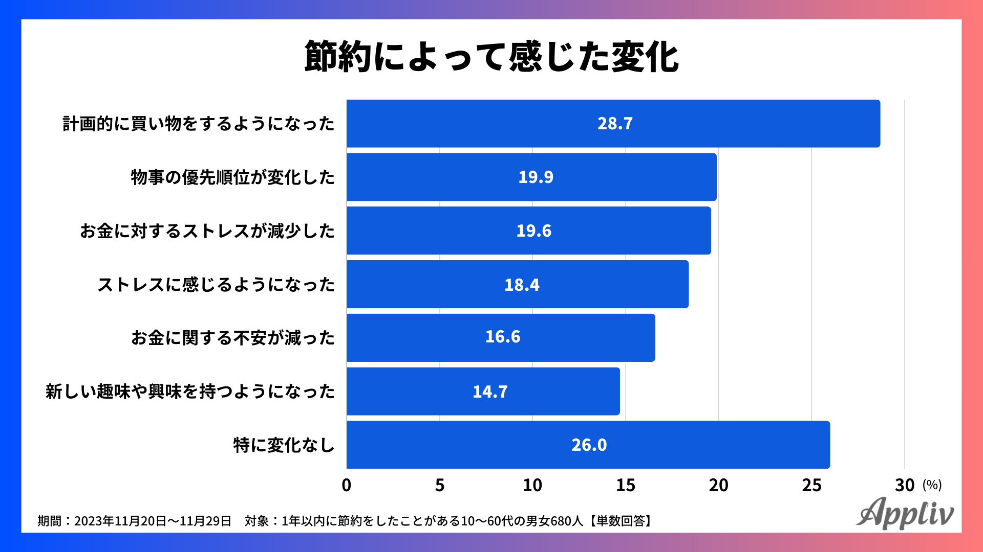 節約に取り組んでから感じた生活の変化を聞いてみると、最多は「計画的に買い物をするようになった(28.7%)」、続いて「物事の優先順位が変化した(19.9%)」、「お金に対するストレスが減少した(19.6%)」でした。