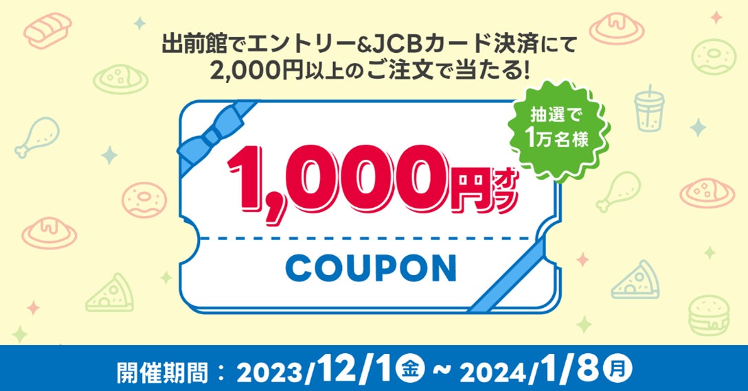 期間中にキャンペーンページからエントリー&対象のJCB カードを利用して『出前館』で2,000 円以上の決済をされた方の中から抽選で1万名さまに、次回以降のご注文時にご利用いただける1,000 円オフクーポンを後日『出前館』より進呈いたします。