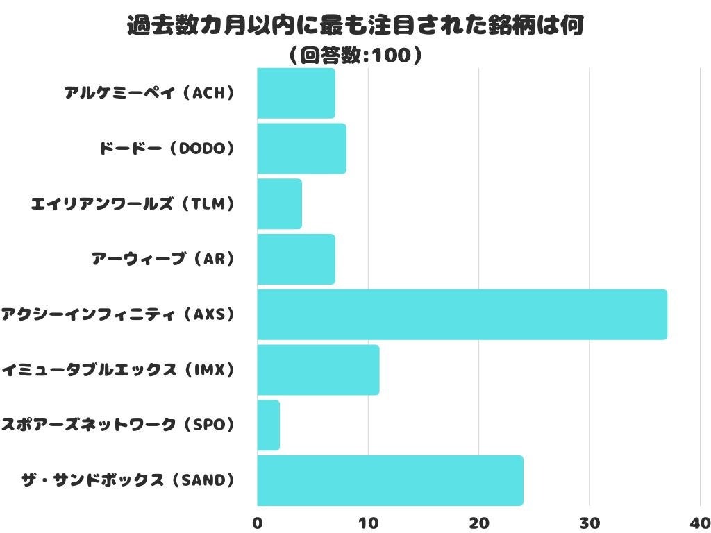 過去数カ月以内に最も注目された銘柄をアンケートにて調査したところ、1位は「アクシーインフィニティ(AXS)」でした。