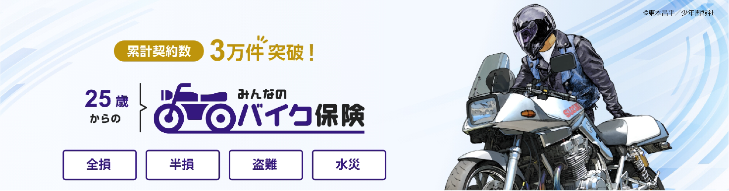 申込時に25歳以上かつ、排気量126cc以上のバイクを所有されている方へ向けた車両保険で、新車・中古車問わず、購入からの経過年数にかかわらずパーツ&アクセサリーを含めた購入金額を補償します。交通事故による車両破損を補償する「車両全損特約」と「車両半損特約」、盗難を補償する「車両盗難特約」、水災被害を補償する