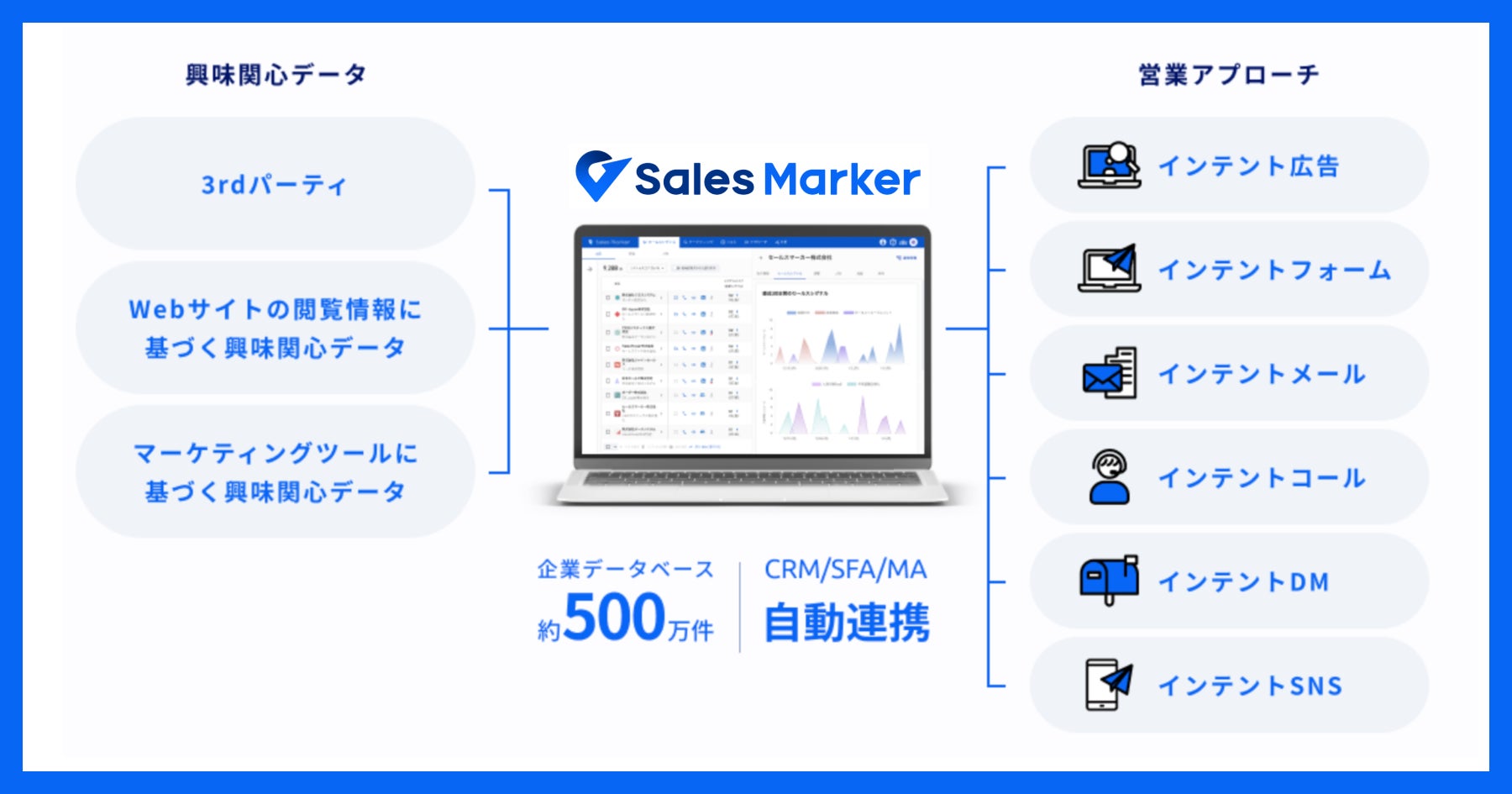 「Sales Marker」は、約500法人の企業データベースと「インテントデータ(興味関心データ)」を組み合わせて活用できるBtoBセールスインテリジェンスです。まさに“今”ニーズが顕在化している企業を見つけて、マルチチャネルアプローチを行う最新の営業手法「インテントセールス」により、顧客に感謝される営業活動に変革します。また、SalesforceやHubSpotをはじめとしたSFA/CRM/MAツールとも連携可能で、総合的でシームレスな営業・マーケティングプロセスを実現します。大手通信会社や大手金融機関、エン・ジャパン様などの人材企業、コミューン様などの成長スタートアップまで、270社を越える幅広い企業に活用されております。今後はAIセールスによって、全ての企業の成長に貢献していきます。