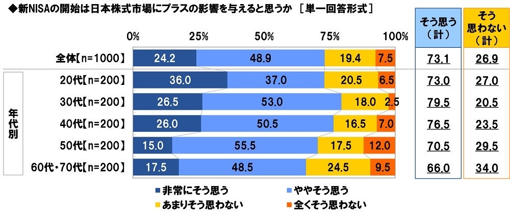 「新NISAの開始は日本株式市場にプラスの影響を与えると思う」投資経験者の73%