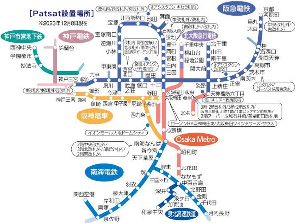 ステーションネットワーク関西は、これまで、「PatSat」を通じたATMサービスを、阪急電鉄や阪神電気鉄道、北大阪急行電鉄、神戸電鉄、南海電気鉄道、泉北高速鉄道、Osaka Metro、神戸市営地下鉄の主要駅構内にて展開してきました。今回、新たに心斎橋駅へ設置することにより、ATMネットワークは、84駅112ヶ所135台になります。