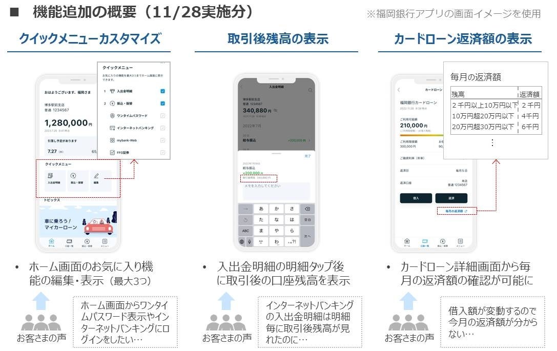 本アプリは、2023年7月(福岡銀行)および10月(熊本銀行・十八親和銀行)のリリース以降も継続的に機能追加・改善を実施しております。具体的には、店舗やコールセンター、アプリのストアレビューなど、お客さまから寄せられたご意見・ご要望をもとに、実装機能や改善内容を企画・設計、開発・テストを経てリリースをおこなっています。