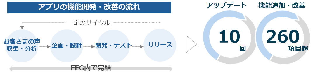 この一連の流れを外部に発注することなくFFG内で完結することでリリースまでの期間を短縮しました。福岡銀行アプリはサービス提供から約4ヵ月間で10回のアップデート、260項目超の機能追加・改善を実施しました。