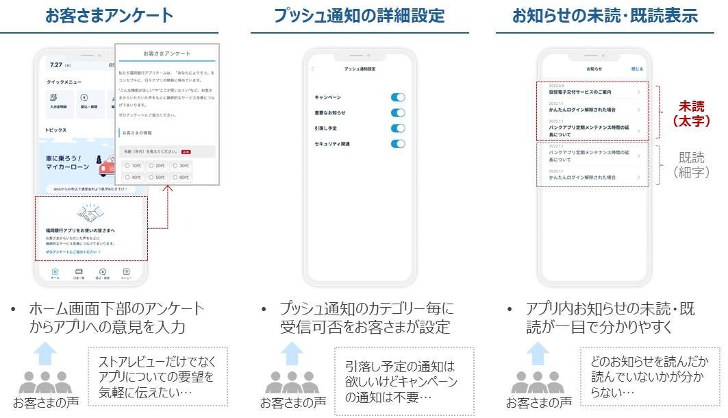 2023年11月28日(火) の機能追加では、より多くのお客さまの声をお寄せいただけるようアプリ内にアンケート入力機能などを実装しております。FFGはこの一連の取り組みをさらに加速・進化させ、お客さまの声に即応できる、真に“寄り添う“銀行アプリの提供を目指してまいります。
