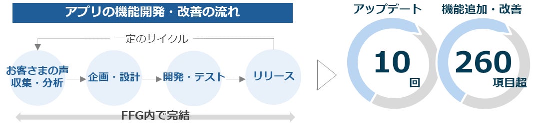この一連の流れを外部に発注することなくFFG内で完結することでリリースまでの期間を短縮しました。福岡銀行アプリはサービス提供から約4ヵ月間で10回のアップデート、260項目超の機能追加・改善を実施しました。