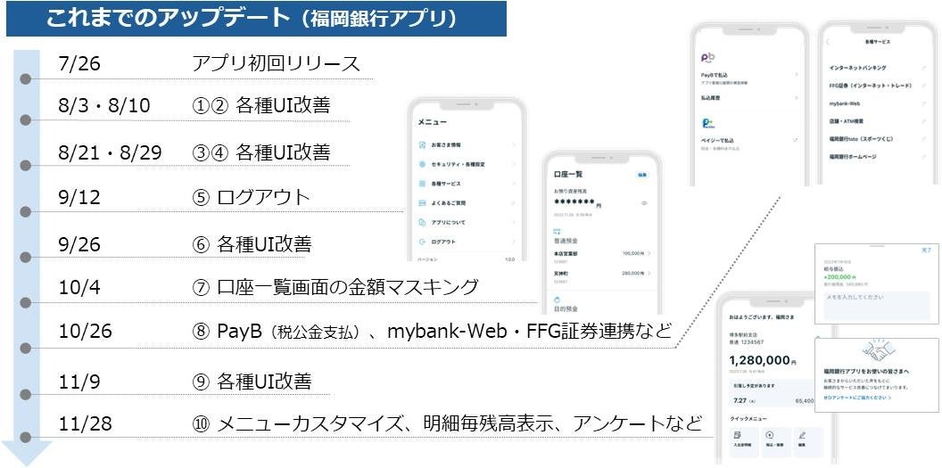 本アプリは、2023年7月(福岡銀行)および10月(熊本銀行・十八親和銀行)のリリース以降も継続的に機能追加・改善を実施しております。具体的には、店舗やコールセンター、アプリのストアレビューなど、お客さまから寄せられたご意見・ご要望をもとに、実装機能や改善内容を企画・設計、開発・テストを経てリリースをおこなっています。