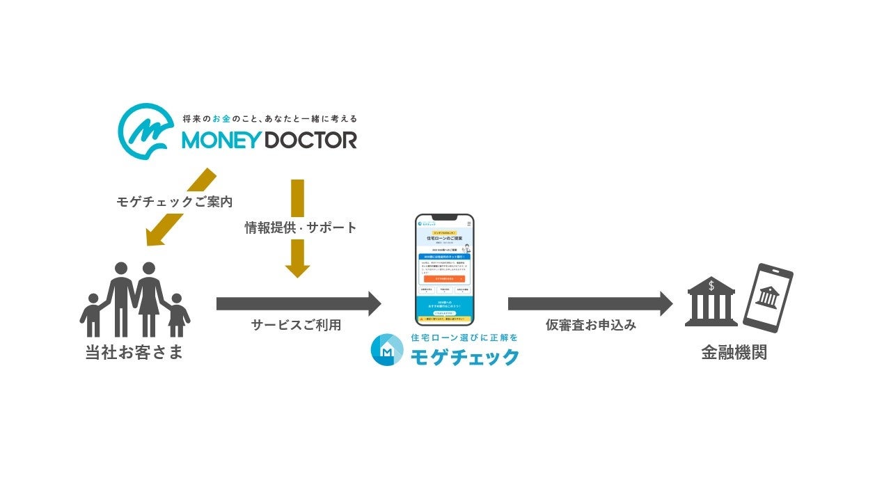 住宅ローンの新規借り入れおよび借り換えニーズのあるお客さまに対し、マネードクターの営業社員がモゲチェックをご案内します。お客さまはモゲチェックのサービスサイトにアクセスすることで、全国主要銀行の住宅ローンを比較検討することができ、ご希望に合う商品があれば、その場でお申込みいただけます。これにより、お客さまの住宅ローン選びの大幅な負担軽減につながります。