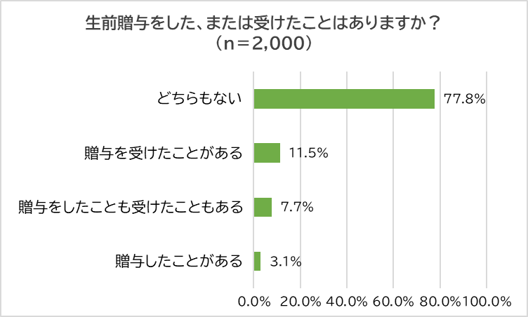 今度は、「生前贈与をした、または受けたことはあるか」聞きました。77.8%が「どちらもない」と回答し最多となり、「贈与を受けたことがある」(11.5%)、「贈与をしたことも受けたこともある」(7.7%)、「贈与したことがある」(3.1%)と続きました。