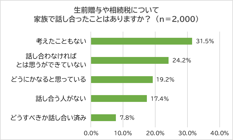 続いて、「生前贈与や贈与税にについて家族で話し合ったことはあるか?」聞きました。最多は「考えたこともない」(31.5%)、以下「話し合わなければとは思うができていない」(24.2%)、「どうにかなると思っている」(19.2%)、「話し合う人がいない」(17.4%)となり、「どうすべきか話し合い済み」は7.8%しかいませんでした。