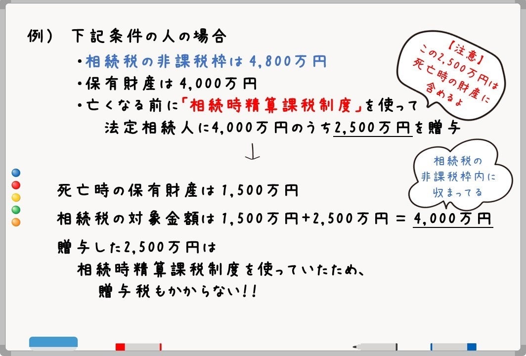 また、この制度は、2,500万円まで非課税で超えた部分にかかる税金も20%なので、一見良さそうに見えます。しかし、それは大きな間違いです。この制度を使った贈与は何年前のものだろうがすべて相続財産に含まれるというルールがあるため、相続税がかかる人よりも相続税がかからない人に向いています。相続税がかかる人は暦年課税が良いでしょう。