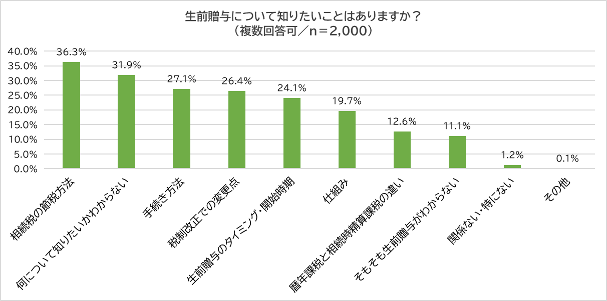 最後に、「生前贈与について知りたいことはあるか?」聞いたところ、「相続税の節税方法」(36.3%)が最多だった一方、「何について知りたいかわからない」(31.9%)も同じくらいいました。