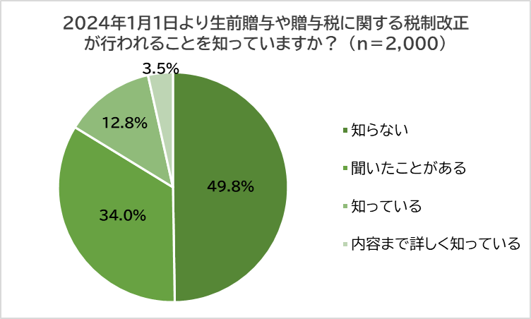 「2024年1月1日より生前贈与や相続税に関する税制改正が行われることを知っているか?」聞いたところ、49.8%「知らない」と回答。「聞いたことがある」(34.0%)、「知っている」(12.8%)、「内容まで知っている」(3.5%)となり、認知度の低さがうかがえました。