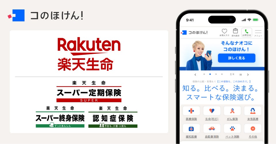 「コのほけん!」は、保険選びをオンラインで完結できるデジタル保険代理店です。 保険の見積り・比較・検討・申込まですべてをデジタル化し「自分に合った保険を、自分で選べる世界」を実現します。コのほけん!は直感的に操作しやすく、イラストやインフォグラフィックスを取り入れることで、複雑で分かりづらいと思われがちな保険商品を見やすく、分かりやすく掲載しています。また、口コミや専門家のコメントが充実しておりインターネットがあれば時と場所を選ばず、保険を検討することができます。