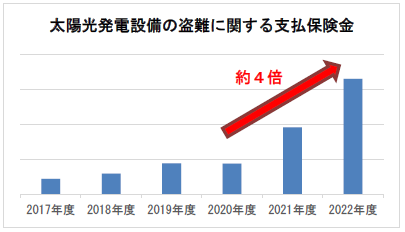 世界的に銅の価格高騰が続いていることを背景に、銅導体ケーブルを大量に使用する太陽光発電設備における大規模窃盗事件が相次いでいます。犯人の検挙も進んでいますが、それ以上に窃盗団数が急増していることから、損保ジャパンでは、太陽光発電設備の盗難に起因する2022年度の支払保険金は2020年度の約4倍に増加し、太陽光発電設備に関する大きなリスクとなっています。