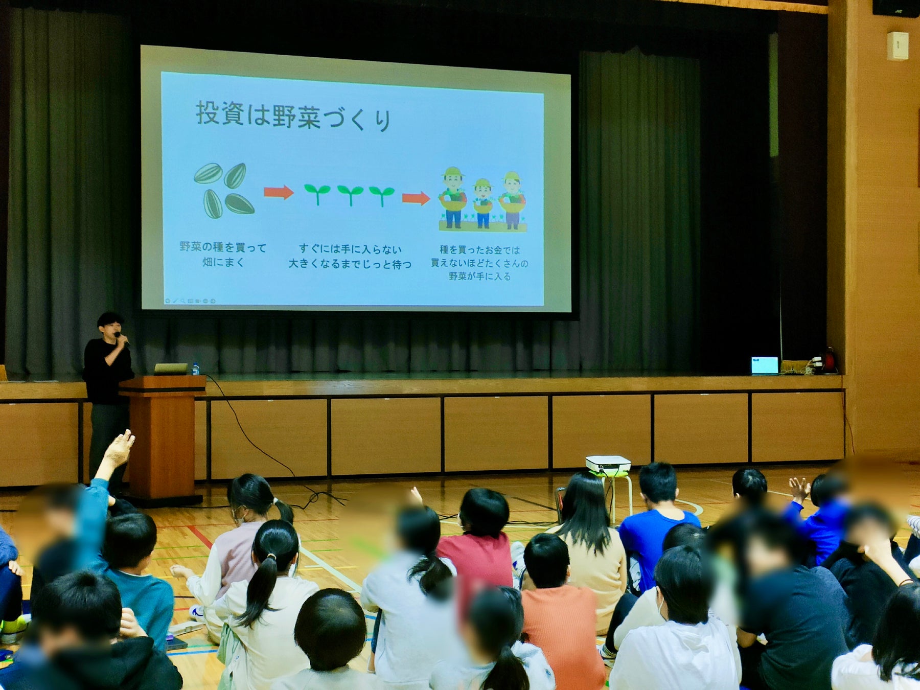 投資を野菜作りに、リスクを台風や猪などに例えながら、投資への向き合い方やリスクを伝えました。