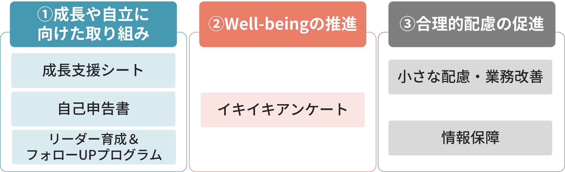 障がいのある社員(以下:メンバー)がイキイキとモチベーション高く働き、個々の特性を活かして パフォーマンスを発揮し続けられるよう、「本人の成長や自立に向けた取り組み」「Well-beingの推進」「合理的配慮の促進」の3つの軸で、さまざまな工夫・改善を進めております。
