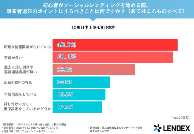 『 明確な情報開示がされている(42.1%)』『実績が多い(41.1%)』『 過去に貸し倒れや返済遅延実績が無い(28.0%)』が上位3つでした。