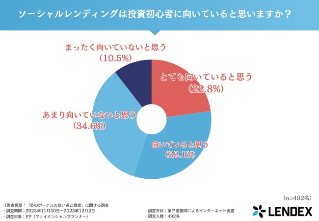 「ソーシャルレンディングは投資初心者に向いていると思いますか?」と聞いたところ、『とても向いていると思う(22.8%)』『向いていると思う(32.1%)』と過半数が向いていると回答しました。