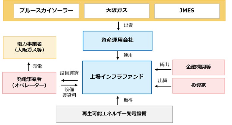 本会社の運営にあたり、ブルースカイソーラーは再エネ発電設備の開発事業者として上場インフラファンドの投資候補案件の提供等を目指します。大阪ガスは電力事業者として、上場インフラファンドが保有する再エネ発電設備で発電された電気の買取およびお客さまへの供給等を行う予定です。JMESは金融事業者であるJA三井リース及びグループの知見・機能を活かし、資金調達面でのサポート等を行うことを検討しています。