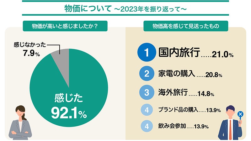 2023年は物価高が叫ばれる1年でしたが、実際にビジネスパーソンの92.1%が物価高を実感しているという結果がでました。物価高の影響で購入を見送ったこととして、「国内旅行」(21.0%)、家電の購入(20.8%)などが上位にあがりました。