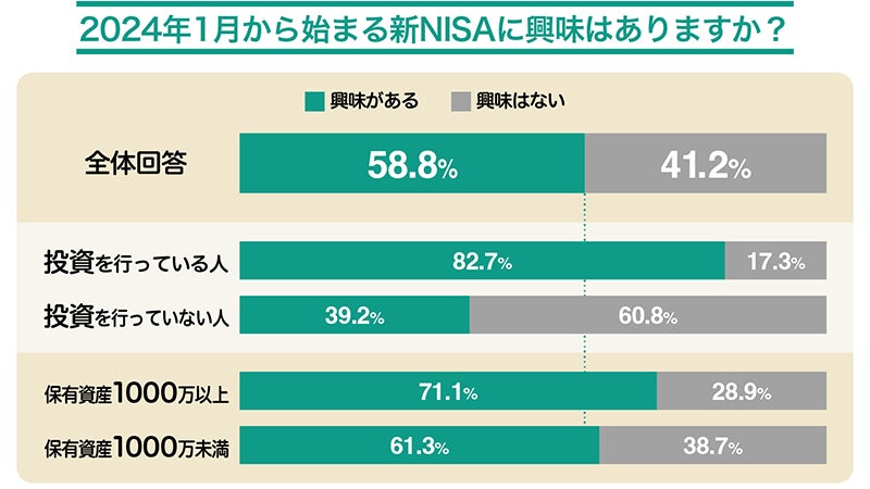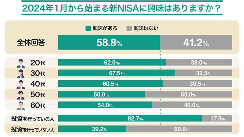 2024年から始まる新NISA制度への関心を聞いてみると、ビジネスパーソンの58.8%が関心ありと回答しました。年代別で見ると、50代(50.0%)、60代(54.0%)であるのに対し、20代(62.0%)、30代(67.5%)の方が新NISA制度への関心が高い傾向にあります。若い人ほど将来に向けた資産形成への意欲が感じ取れます。