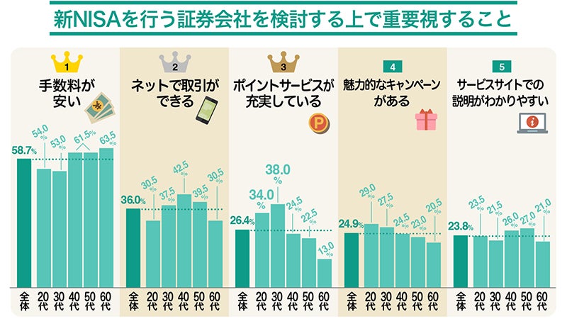 また、新NISAを行うにあたり、証券会社を検討する上で重要視することは、「手数料が安いこと」が58.7%でトップになりました。次いで、「ネットで取引ができること」(36.0%)になりました。「ポイントサービスが充実していること」(26.4%)、「魅力的なキャンペーンがあること」(24.9%)なども一定の支持を集めました。若い人ほど「ポイントサービスが充実していること」をあげる傾向にあることもわかりました。