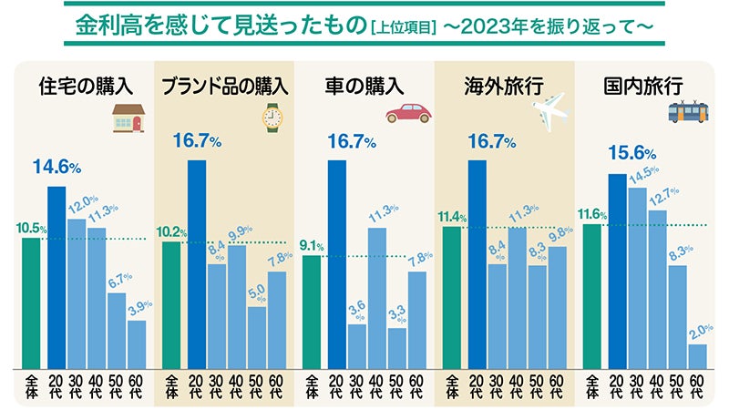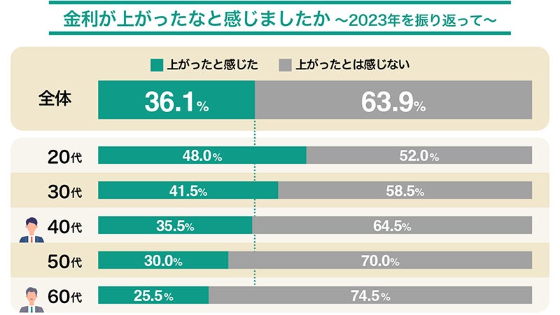 また、金利の上昇も2023年のトピックとなりました。金利高については36.1%のビジネスパーソンが実感しているという結果になりました。若い人ほどその傾向は高く、「住宅の購入」や「ブランド品の購入」などの項目でその傾向は顕著となりました。