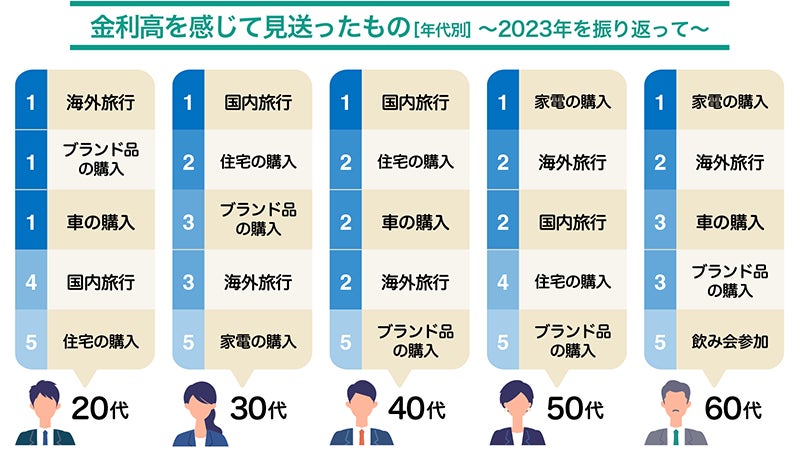 若い人ほど金利上昇を実感、住宅購入やブランド品の購入を見送る傾向に。2024年も消費を控える傾向にあるが、国内旅行への関心は高まる。半数以上が2024年に始まる新NISAへの関心あり。