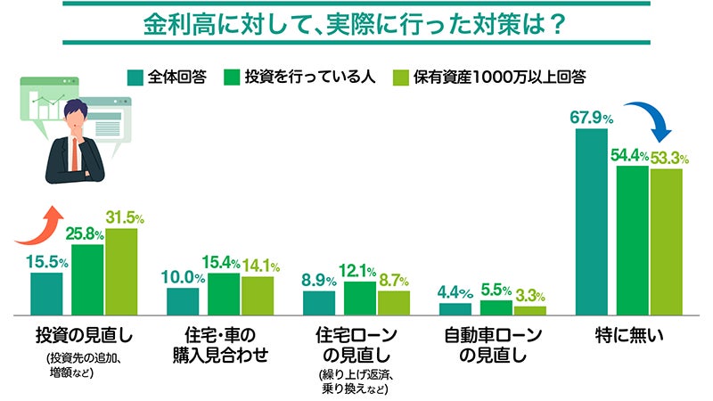 また、金利高を実感している人に、実際に金利高に対して行った対策を聞くと、67.9%ものビジネスパーソンが「特に無い」と回答しました。しかし、投資を行っている人や保有資産が多い人ほどなんらかの対策を行っていることがわかり、危機意識が高い様子がうかがえます。また、実際に行った対策としては「投資先の見直し」(15.5%)、「住宅や車などの購入の見合わせ」(10.0%)などが上位にあがりました。この結果についても、保有資産が高い人ほど対策意識が高い傾向がわかります。