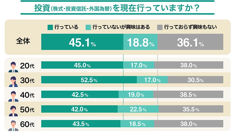 投資を行っているビジネスパーソンは45.1%と約半数が投資をしている現状が明らかになりました。また、興味があると回答した人も18.8%となり、投資への関心の高さが伺えます。世代別に見ると、30代が52.5%と投資をしている人が最も多い結果となりました。20代も40代以降に比べて高い結果となり、若い人ほど投資をしていることがわかりました。