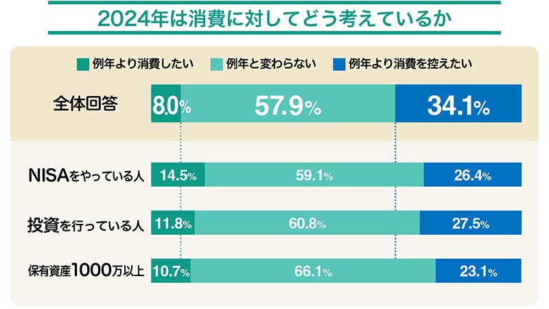 2024年の消費について聞いてみると、「例年より消費したい」と回答したビジネスパーソンは全体の8.0%に留まり、「例年と変わらない」が57.9%と多くを集めました。「例年より消費を控えたい」と回答したビジネスパーソンも34.1%おり、引き続き消費については慎重な傾向が見られます。また、投資を行っている人やNISAをしている人、保有資産が多い人ほど「例年より消費したい」と回答していることも明らかになりました。