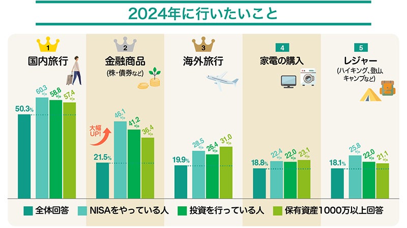 また、実際に2024年に行いたいことを聞いてみると、「国内旅行」が50.3%と半数以上を集め、「国内旅行」への関心が高いことがわかりました。多くの項目で保有資産が高いほど行いたいことのポイントが高く、保有資産の高い人ほど2024年は消費にアクティブに動きたいという傾向がわかります。