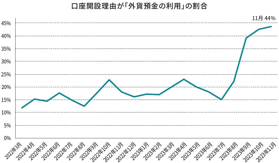 ソニー銀行への口座開設理由として、「外貨預金の利用」と回答するお客さまの割合も増加傾向にあり、2023年11月に口座開設をしたお客さまの約44%のかたが「外貨預金の利用」を挙げられています。