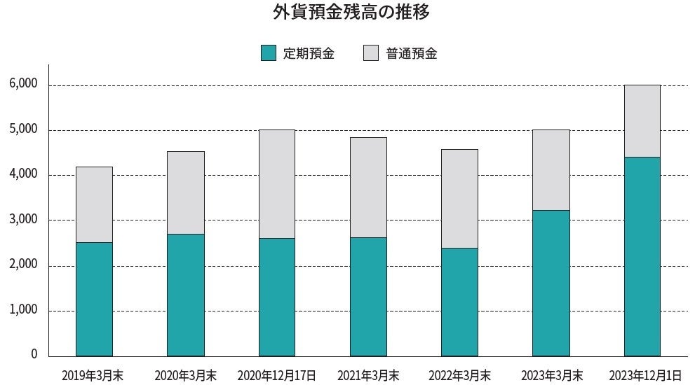 こうした外貨を貯めて使える利便性をご支持いただき、2023年12月1日(金)時点で外貨預金残高が6,000億円に到達しました。