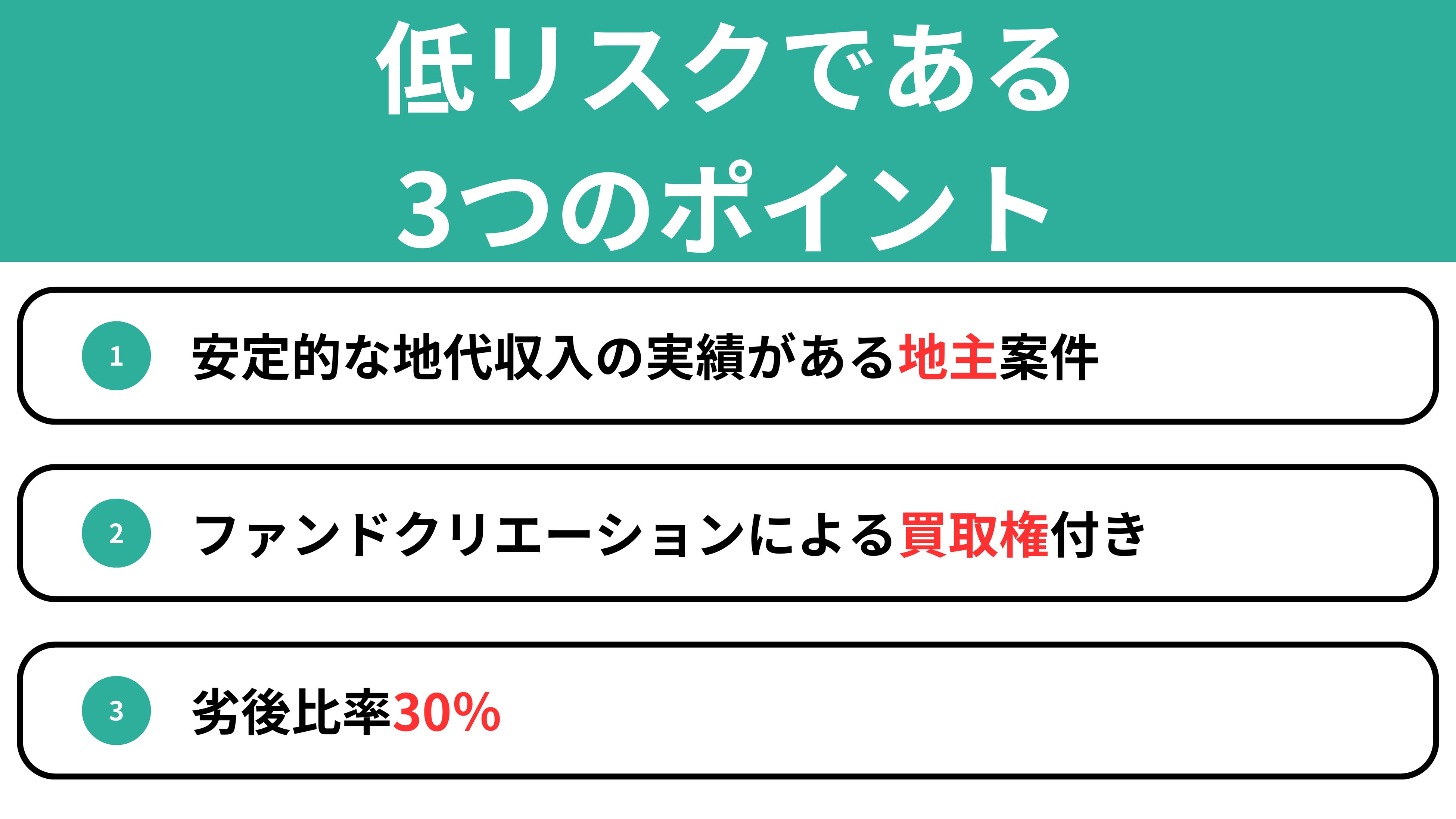 第3-3号ファンドでは、低リスクである3つのポイントがあります。