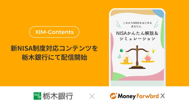 株式会社マネーフォワードは2023年12月21日(木)から、金融機関が個人顧客向けに金融商品を提案する際に活用できるWEBコンテンツ『XIM-Contents』で、新NISA制度についての解説やシミュレーションができるコンテンツを配信します。第一弾の提供先は栃木銀行です。このコンテンツでは、新NISA制度の仕組みや投資のコツを分かりやすく解説するページや、NISA口座で投資信託を購入した場合の簡単なシミュレーションを用意しており、資産運用が初めての方に関心を持ってもらうきっかけを提供します。