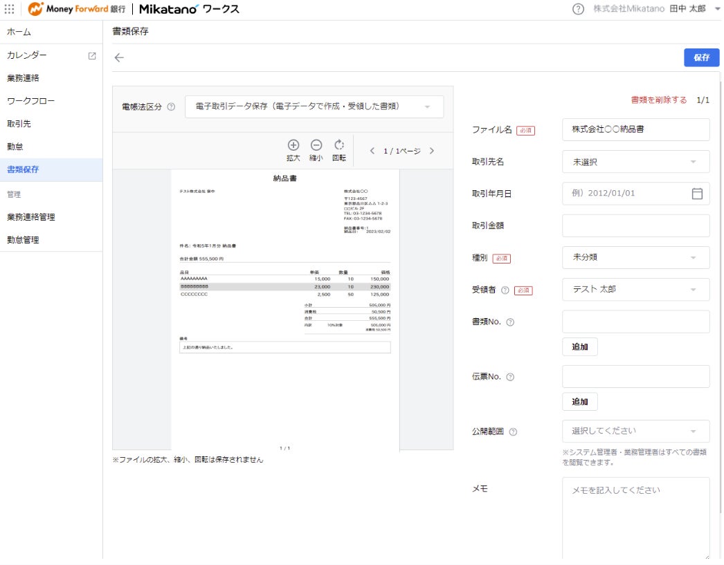 株式会社マネーフォワードは、請求書管理サービス『Mikatano インボイス管理』およびDX支援サービス『Mikatano ワークス』に、電子帳簿保存法のスキャナ保存要件に対応する機能を追加しました※。請求書や領収書など書類の種別に応じて各サービスに書類をアップロードすると、電子帳簿保存法に定められた形式で保存できます。