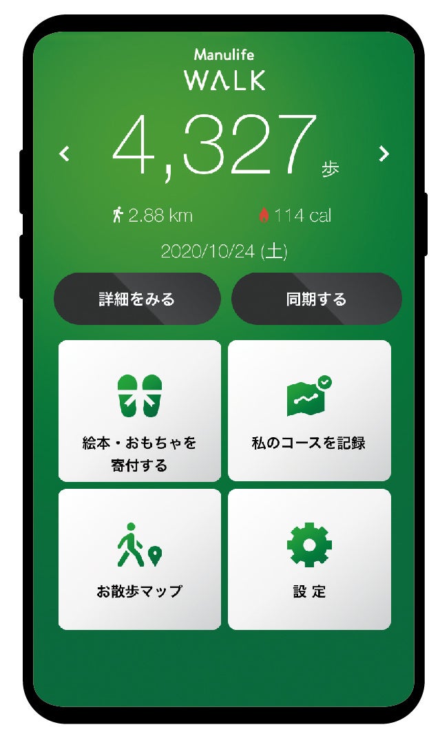 ユーザーが歩数を記録したり、散歩コースを設定したり、それらをソーシャル・ネットワーキング・サービス(SNS)で共有することができるなど、歩くことを楽しみ、習慣化するための工夫をこらした機能が搭載されています。寄付プログラムに参加し、50万歩を達成すると 1 回、80 万歩で 2 回、3 回目以降は 100 万歩ごとに 1 回寄付することができます。また、当社は本アプリを利用し、社員の歩いた歩数を義援金として寄付するプログラムを実施するなど、社員の健康促進および社会貢献を促す活動も展開しています。詳しくはこちら( https://www.manulife.co.jp/ja/individual/about/insight/manulifewalk.html )。