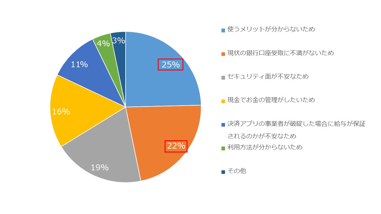 一方、デジタル給与の利用意向に関する質問で、「どちらかといえば使いたくない」「全く使いたくない」と答えた人に対して、その理由を質問したところ、「使うメリットが分からないため」が25%、「現状の銀行口座受取に不満がないため」が22%となった(図8)。日本では銀行口座利用率が極めて高く、月次の口座引落が普及していることもあり、デジタル給与を利用するメリットが十分に認知されていないことが分かる。