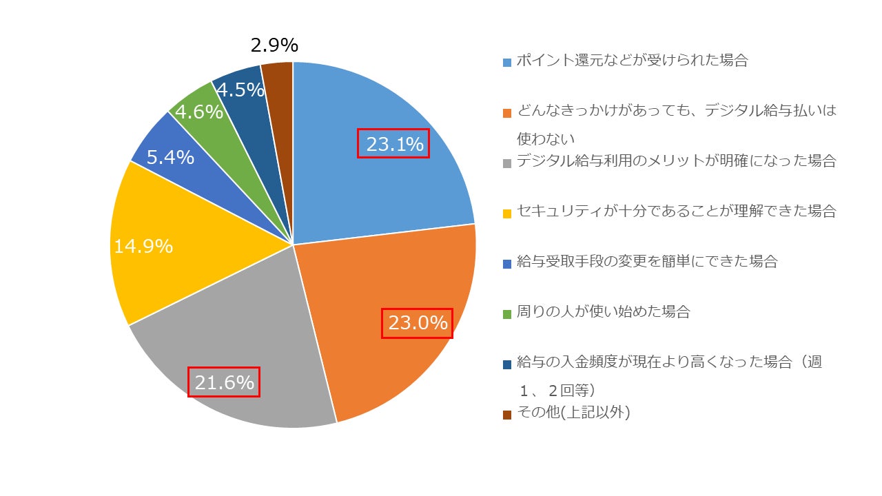 同様に、デジタル給与の利用意向に関する質問で「どちらかといえば使いたくない」「全く使いたくない」と答えた人に対して、「何があればデジタル給与を利用したいと思うか」を聞いた結果、「ポイント還元などが受けられた場合」が23.1%で最も多く、次いで僅差で「どんなきっかけがあっても、デジタル給与払いは使わない」(23.0%)、「デジタル給与利用のメリットが明確になった場合」(21.6%)という結果となった(図9)。