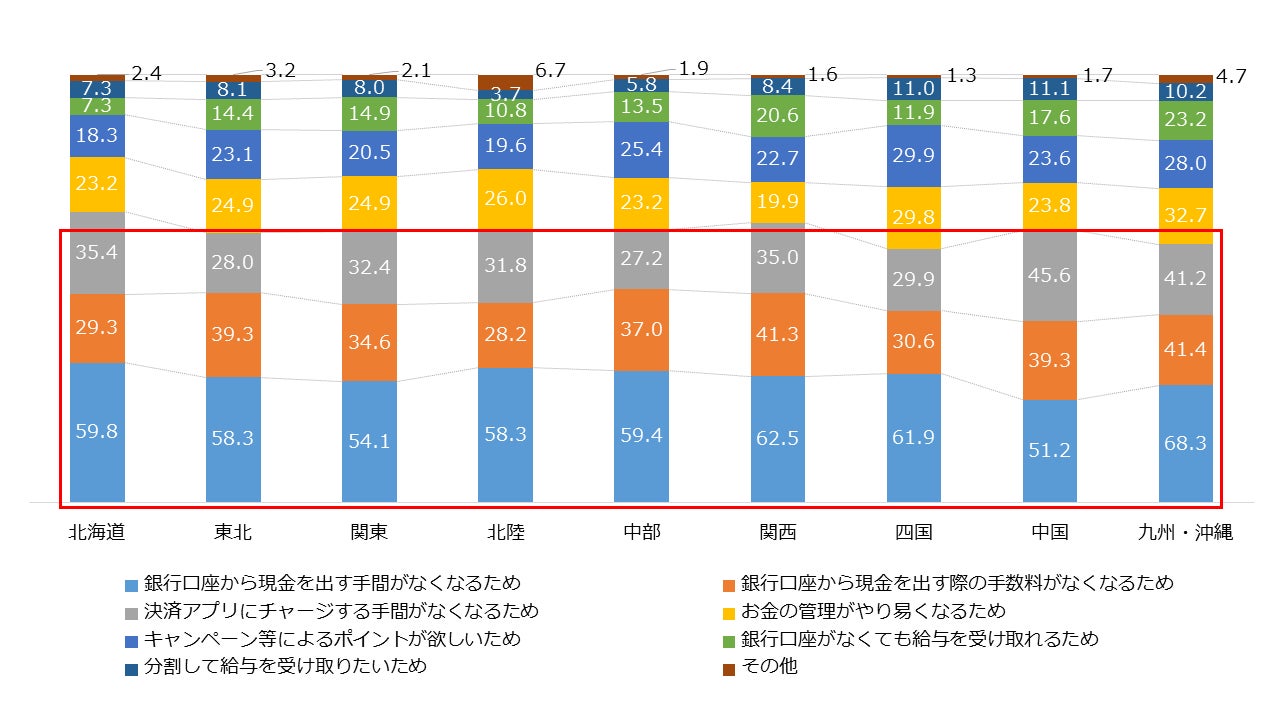 デジタル給与の受け取りを希望する理由として、「銀行口座から現金を出す手間がなくなるため」、「銀行口座から現金を出す際の手数料がなくなるため」、「決済アプリにチャージする手間がなくなるため」が主で、既存の銀行口座受取に関する不満を解消するためにデジタル給与の利用を検討する傾向が見られた(図5)。受け取りを希望する理由について、地域による差は見られなかった。