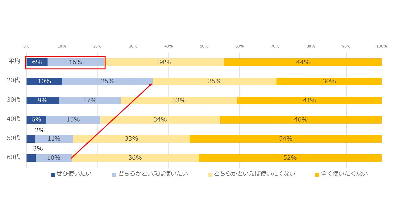 年代別にデジタル給与の利用意向について質問をしたところ、「ぜひ使いたい」と答えた人が全体の6%、「どちらかといえば使いたい」と答えた人が16%存在した。また、「ぜひ使いたい」「どちらかといえば使いたい」と答えた人の合計は、20代が35%、30代が26%、40代が21%、50代と60代が13%となり、年齢が若くなるにつれてデジタル給与の利用意向が高くなることが分かる(図2)。