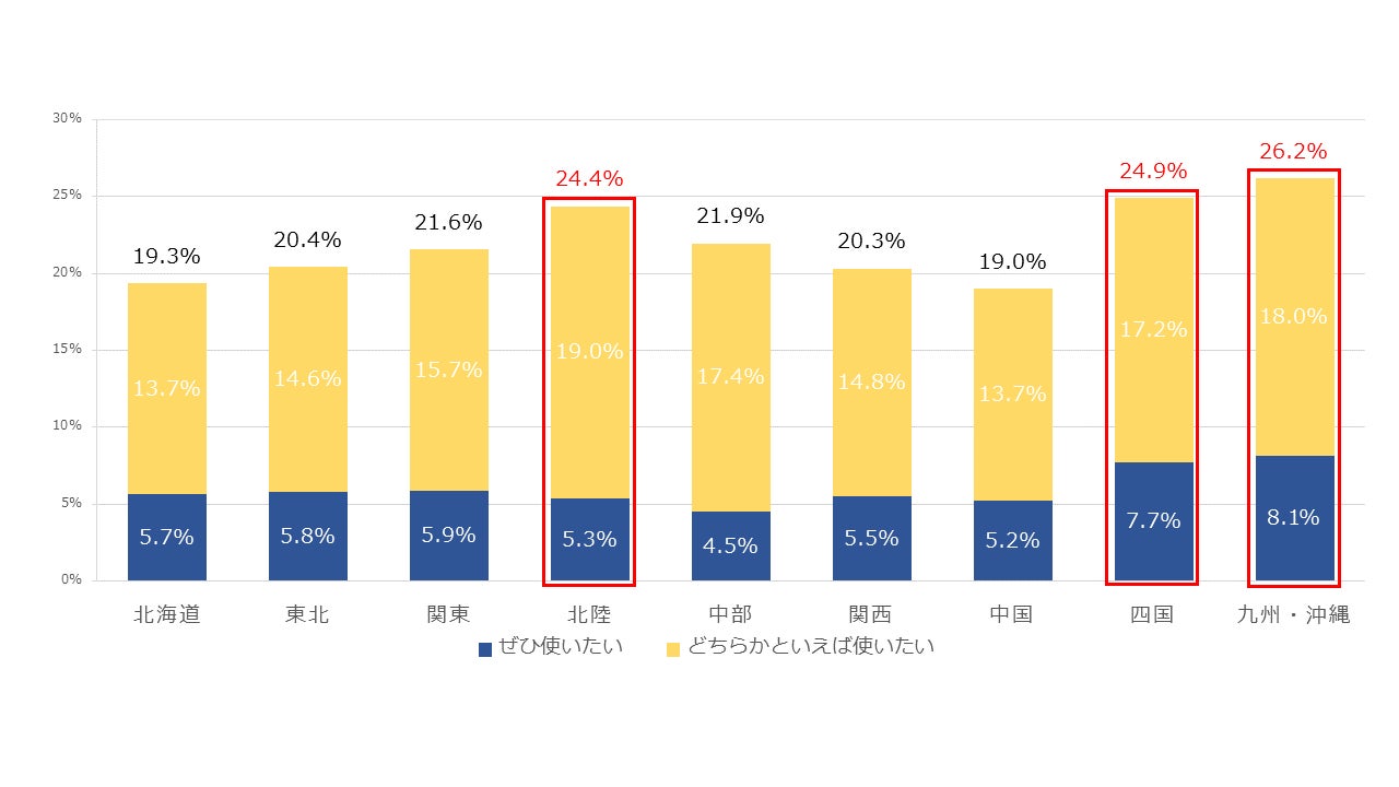 地域別に見ると、「九州・沖縄」>「四国」>「北陸」の順にデジタル給与の利用意向が高い(図4)。
