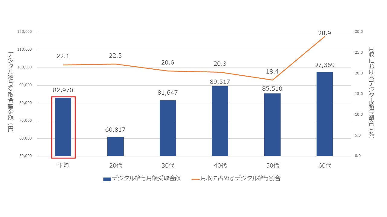 また、今回のアンケート結果より、デジタル給与で毎月受け取りたい平均額は約8.3万円 (年間で約100万円)となり、年代別平均月収⁴に占めるデジタル給与の割合は平均で22.1%ということが分かった(図3)。