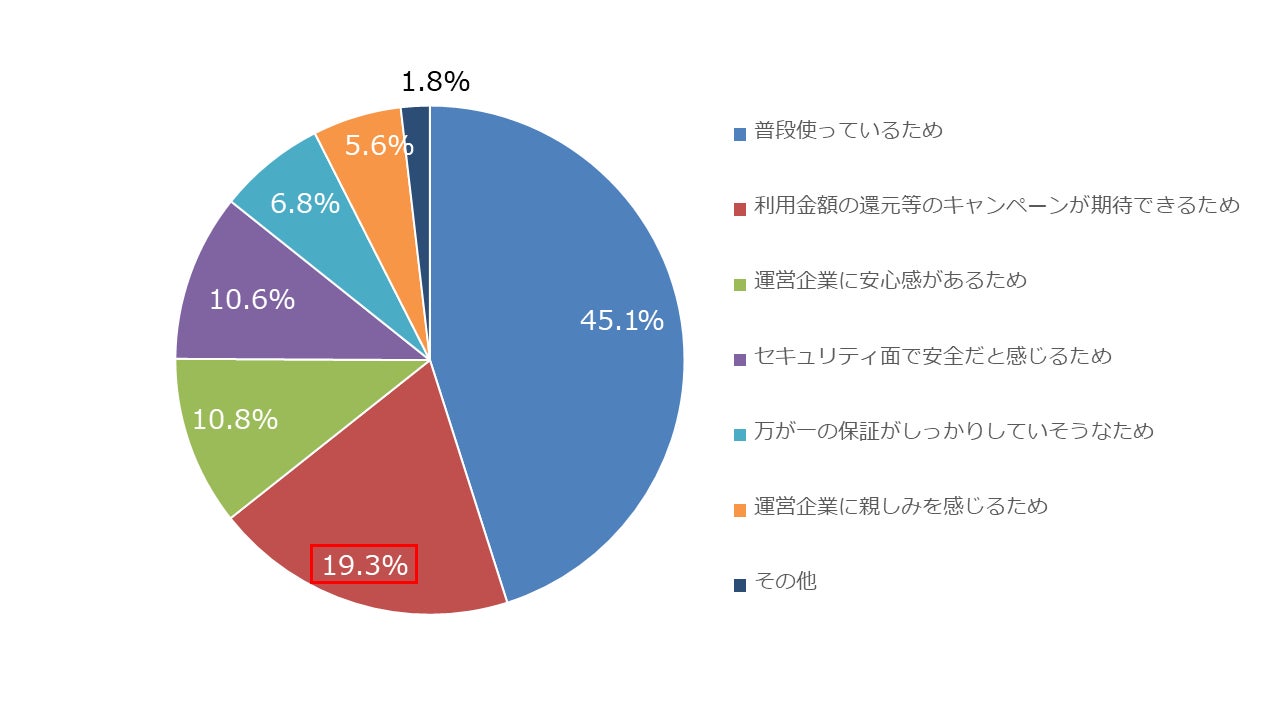 デジタル給与を受け取る決済サービスを選んだ理由は、「普段使っているため」が45%、「利用金額の還元等のキャンペーンが期待できるため」が19%、「運営企業に安心感があるため」が11%という結果となった(図7)。