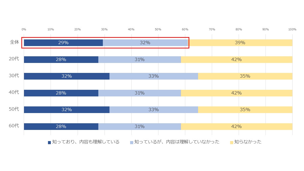 デジタル給与払いに関する認知度について聞いたところ、「知っており、内容も理解している」と答えた人が全体の29%、「知っているが、内容は理解していなかった」と答えた人が32%であった(図1)。また、年齢毎にデジタル給与の認知度を見てみると、各年代で認知度の大きな差は見られなかった。